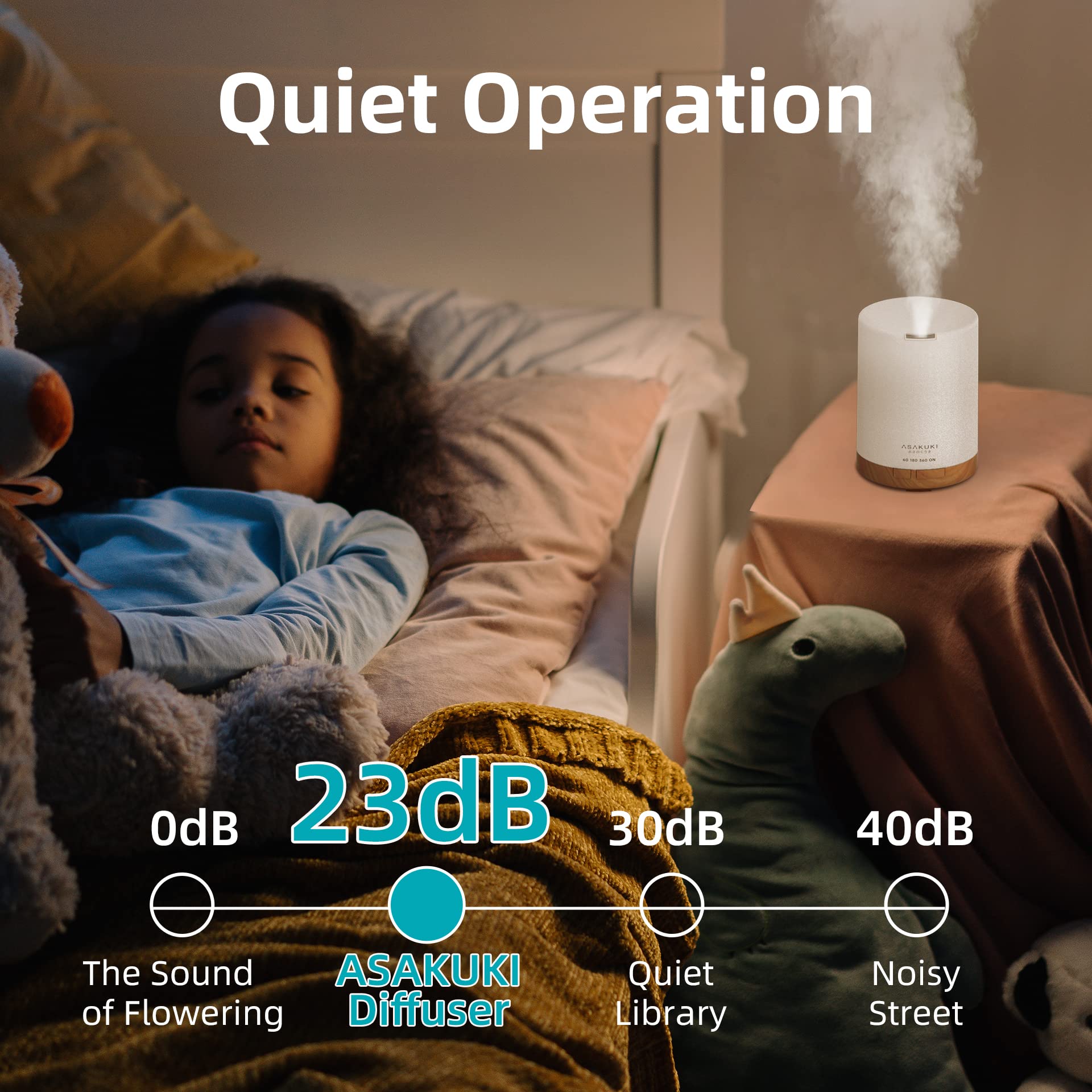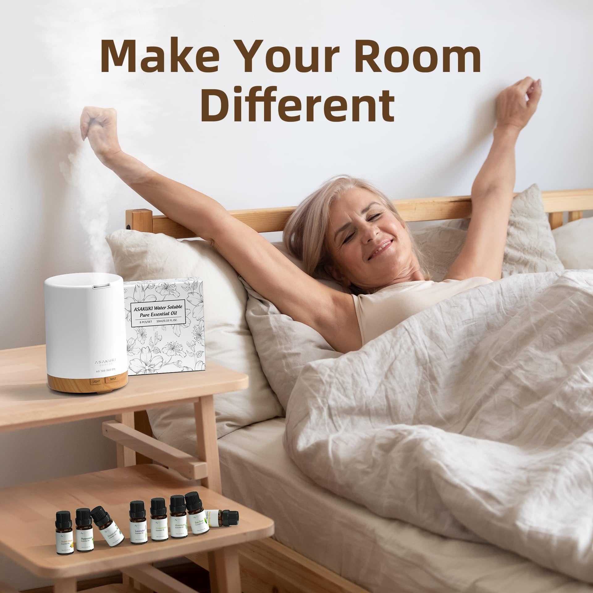 - [Suitable for Home Use] Compact size, 300ml water tank, 4 timed settings, ambient light, and auto shut-off button are all features of the ASAKUKI oil diffuser. It is simple to set up and use on a desk, dresser, nightstand, or other hard surface