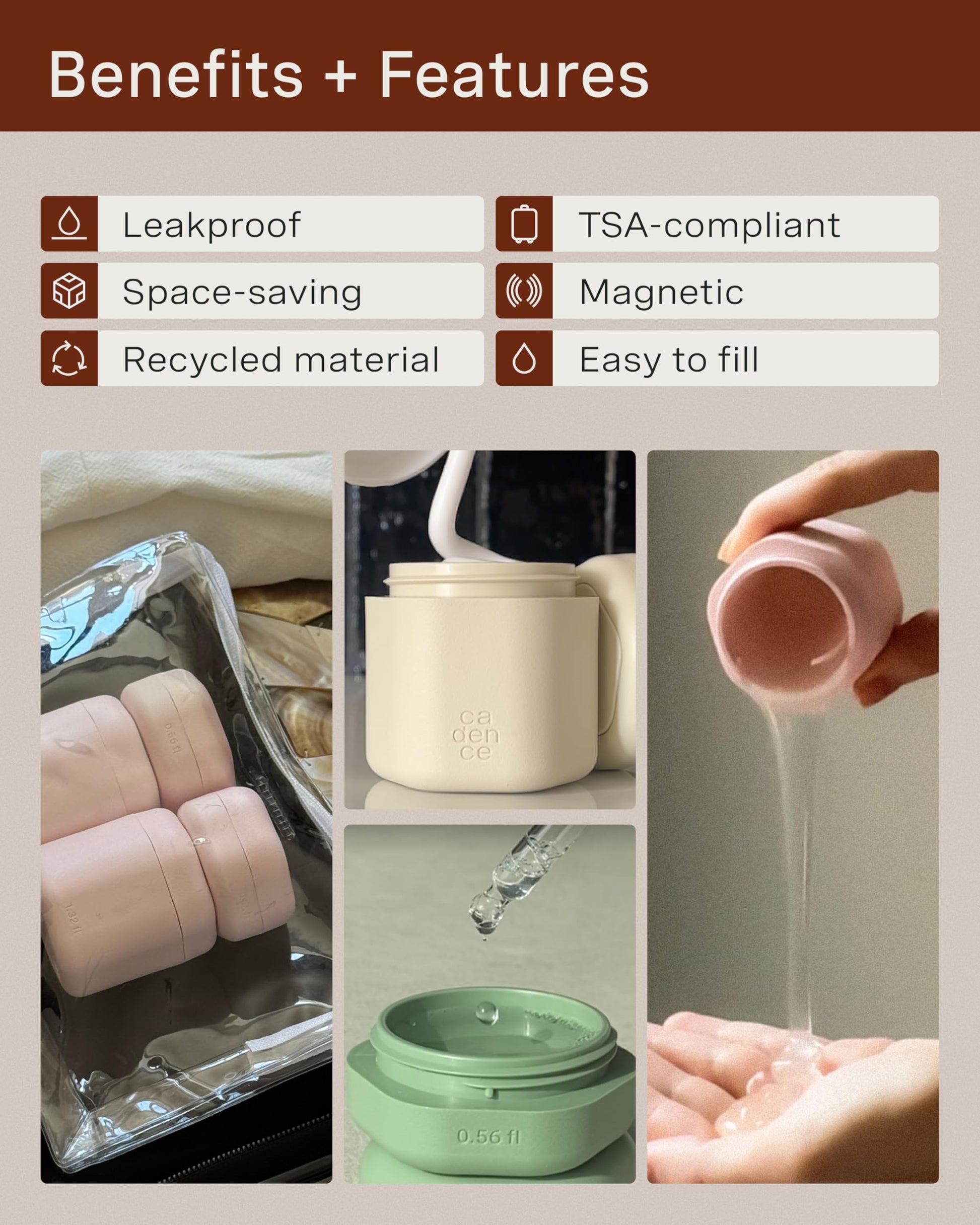 - CADENCE NOW LIVE ON AMAZON: Introducing Cadence’s Skincare Set. The perfect leakproof travel containers to hold your skincare routine for when you’re on the go. Each capsule comes with a labeled tile: Cleanser, Moisturizer, and a Sun Icon label.