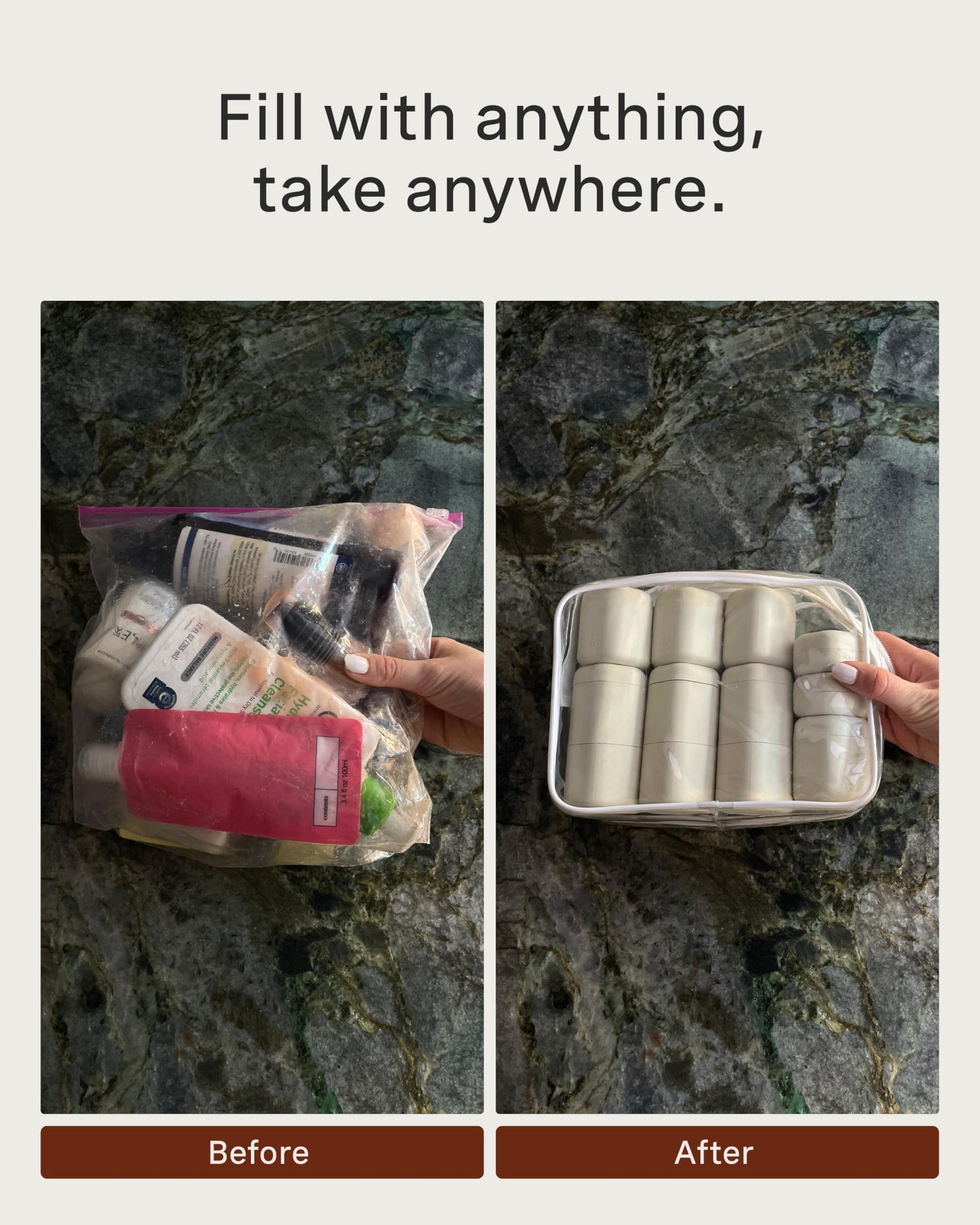 - TSA-COMPLIANT & 100% LEAKPROOF: Rest easy while traveling with our modular travel capsules. They are not only TSA-compliant but also 100% leakproof, ensuring your liquids and essentials stay securely contained. Pack these carry on reusable containers and say goodbye to messy spills on your journeys!