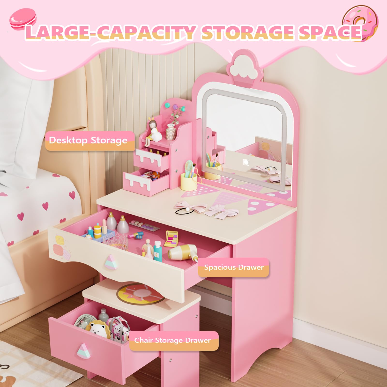 JOYMOR Kids Vanity with Lights, Dessert-Themed Vanity with Cloud-Like LED Light Strip & Drawer, Makeup Desk with Stool for Little Girls Ages 3-8 (Pink)
