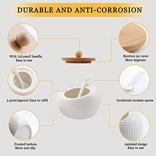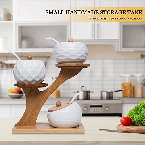 MIATTCLD Porcelain Condiment Jar Set, Spice Jars with Bamboo Lids and Spoon, Wooden Tray, 170 ML (5.8 OZ), Used to Store Tea, Spices, Coffee, Set of 3(White)