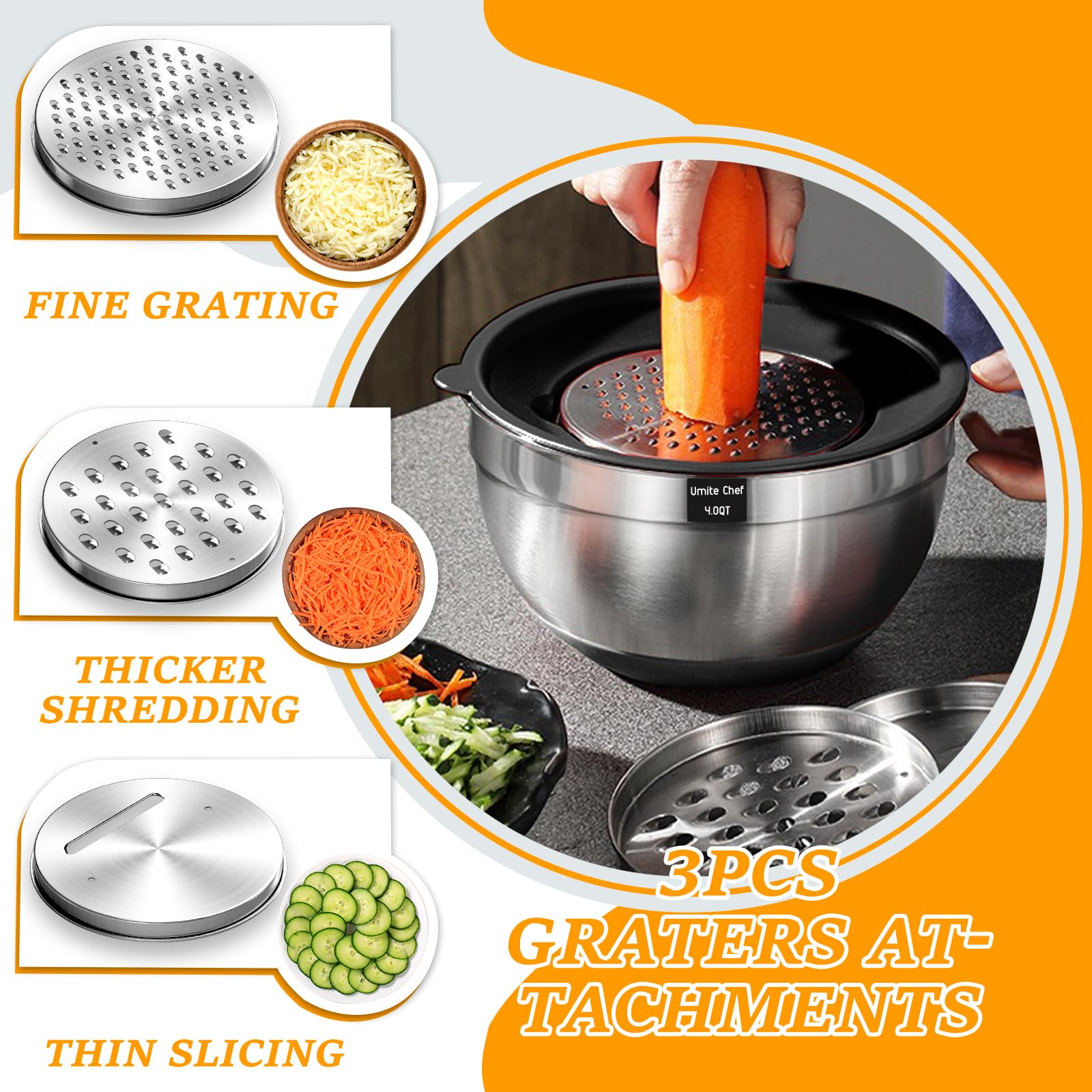 - AIRTIGHT LIDS & 3 GRATER ATTACHMENTS:The airtight lids that come with this mixing bowl set make it easy to store ingredients and leftovers without worrying about spills or leaks. 3.5qt had a removable lid inside the main lid, for adding contents or pairing it with your blender without removing the entire lid to prevent splash. This bowl set comes with 3 different grater attachments (slicing/grating/shredding) just shred or slice right into the bowl!