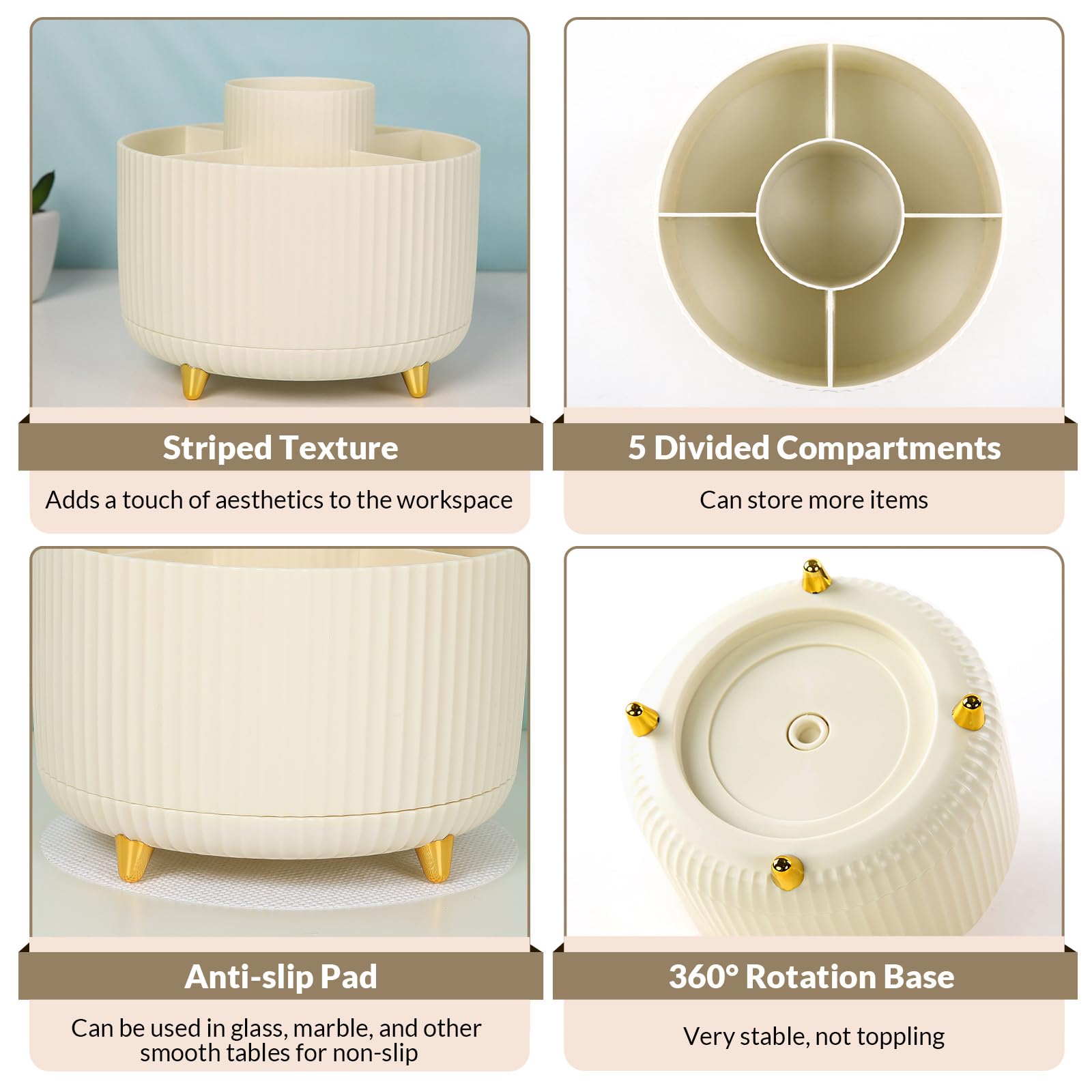 - Rotating Pen Holder: This pencil and pen holder features a 360-degree rotation, ensuring easy access to your writing tools and making it even more convenient to find what you need. Additionally, it comes with a non-slip pad that keeps the holder firmly in place on smooth desks or countertops, preventing annoying slips or slides