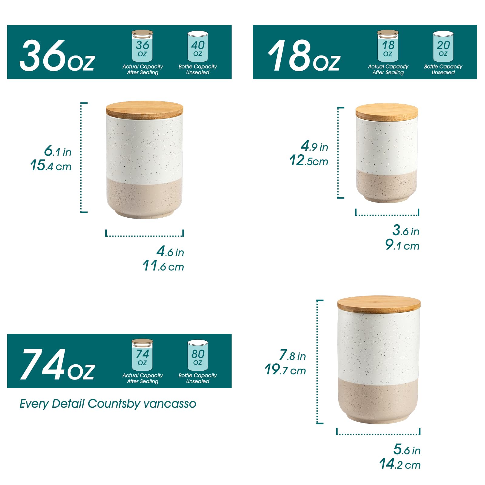 - 【3 Sizes for Versatile Storage】This set includes 3 canisters in different sizes (4.9"x3.6", 6.1"x4.6", 7.8"x5.6") with capacities of 18 oz, 36 oz, and 74 oz. Perfect for storing flour, sugar, coffee, tea, spices, and more. Note: Solid storage capacity may vary due to density differences